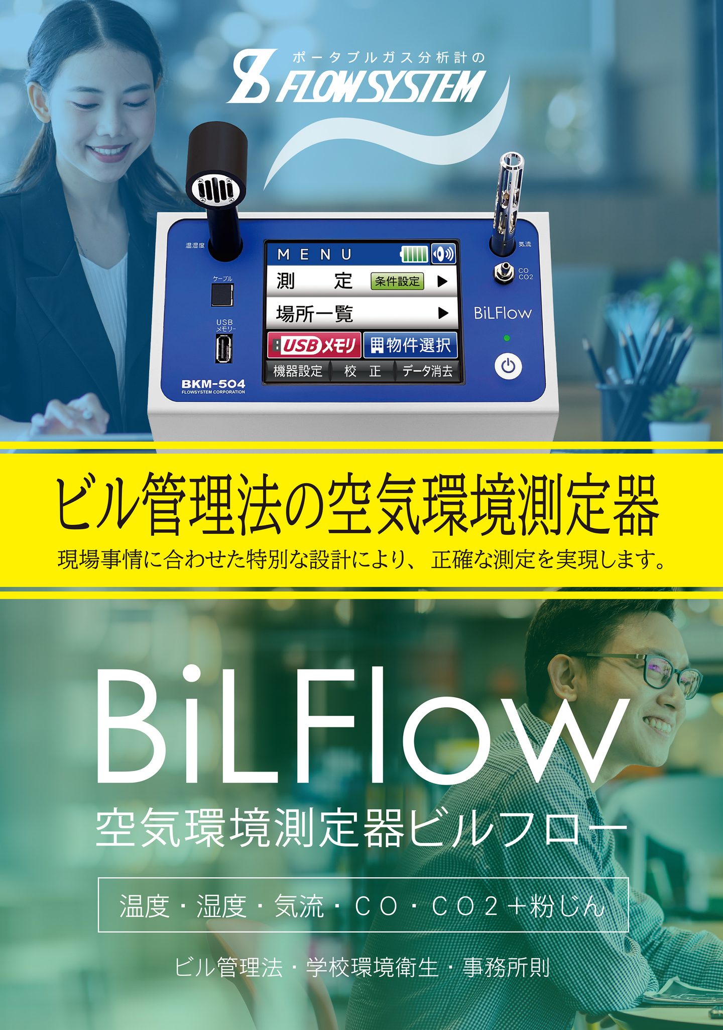 当社製品である空気環境測定器ビルフロー(BKMシリーズ)は、主にビル管理法における測定でご使用頂いております。そのため上記のような粉じん計較正が必要であり、また6項目同時測定という測定器としては特異な特長から、何らかのかたちで年1回のお預かりを推奨しています。