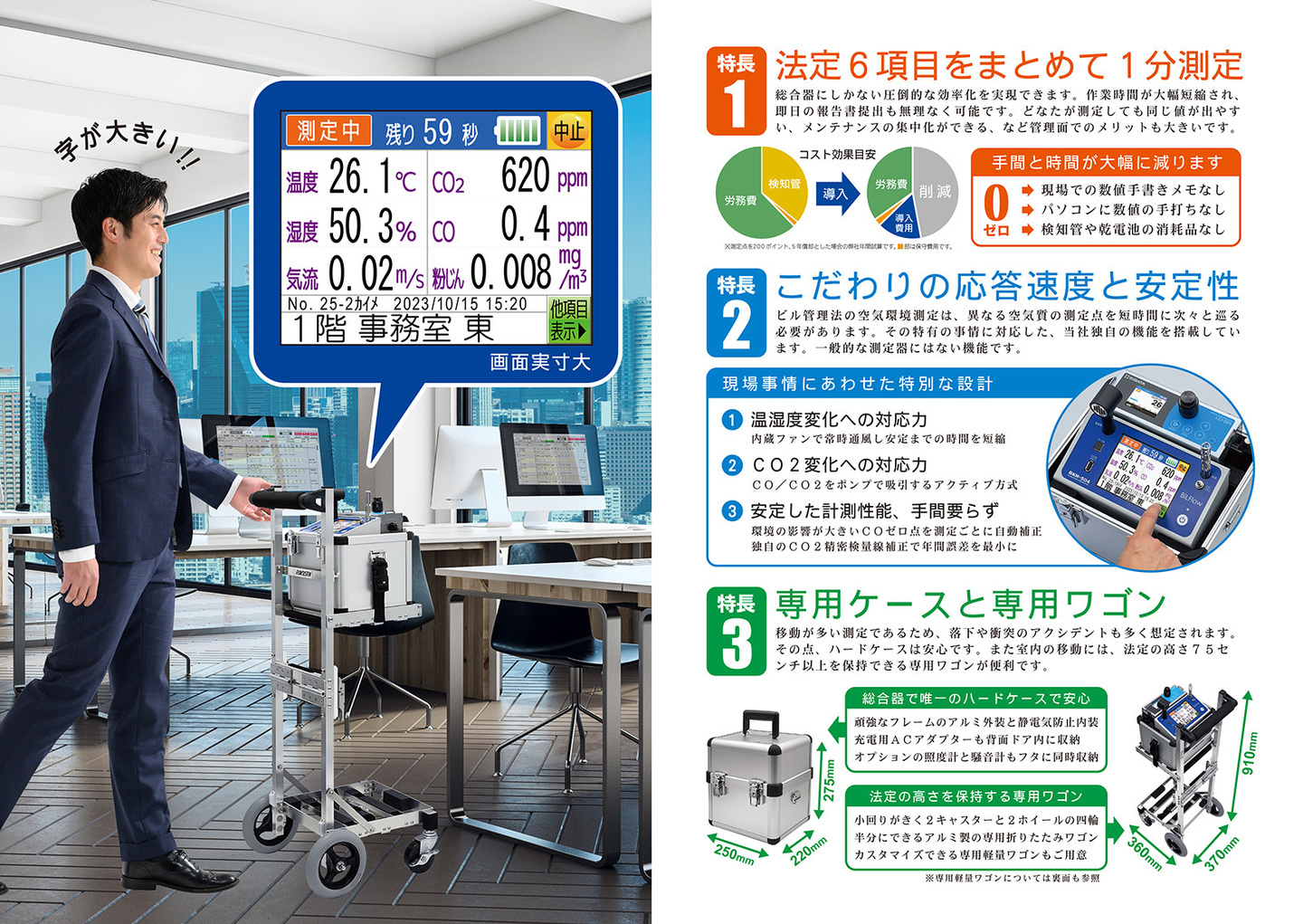 特に空気環境測定器については、25年以上の実績をもとに、建築物衛生法に特化した改良を続け、モデル更新を重ね、メンテナンスサービスの拡充をし、ビル管理市場では大きなご評価を頂いています。